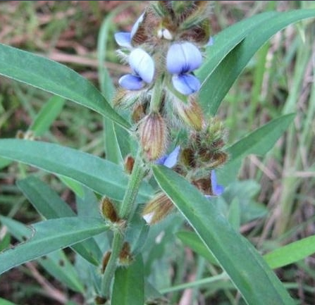 总状花序顶生、腋生或密生枝顶形似头状,亦有叶腋生出单花,花1—多数;苞片线状披针形,长4-6毫米,小苞片与苞片同形,成对生萼筒部基部;花梗短,长约2毫米;花萼二唇形,长10-15毫米,密被棕褐色长柔毛,萼齿阔披针形,先端渐尖;花冠蓝色或紫蓝色,包被萼内,旗瓣长圆形,长7-10毫米,宽4-7毫米,先端钝或凹,基部具胼胝体二枚,翼瓣长圆形或披针状长圆形,约与旗瓣等长,龙骨瓣中部以上变狭,形成长喙;子房无柄。荚果短圆柱形,长约10毫米,苞被萼内,下垂紧贴于枝,秃净无毛;种子10-15颗。花果期5月至翌年2月。 [1]