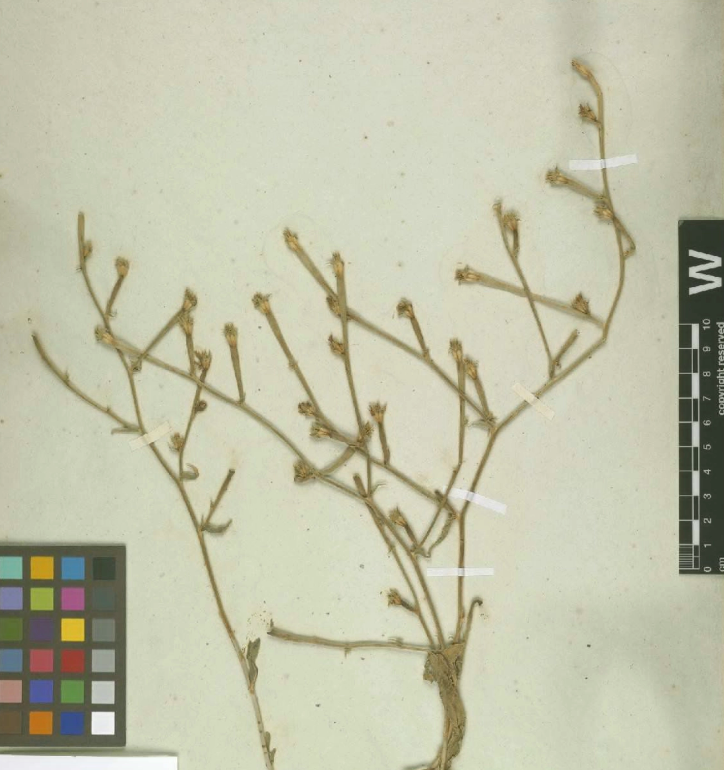 头状花序单生或2-3个生于茎端或枝端,含15枚舌状小花。总苞钟状,总苞片2层,外层宽卵形,长6-7.5毫米,下半部坚硬,革质,内层披针形,长9-10毫米,2层苞片基部相连,外面被头状具柄的长腺毛。舌状小花浅蓝色,花冠筒上部被白色细柔毛。瘦果4-5棱形,长2-3.5毫米。冠毛白色,膜片状,长近1毫米,顶端细齿裂。 [2]