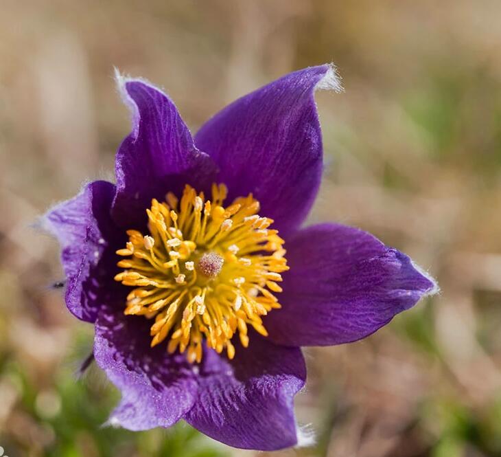 花葶1(-2),有柔毛;苞片3,基部合生成长3-10毫米的筒,三深裂,深裂片线形,不分裂或上部三浅裂,背面密被长柔毛;花梗长2.5-5.5厘米,结果时长达23厘米;花直立;萼片蓝紫色,长圆状卵形,长2.8-4.4厘米,宽0.9-2厘米,背面有密柔毛;雄蕊长约为萼片之半。聚合果直径9-12厘米;瘦果纺锤形,扁,长3.5-4毫米,有长柔毛,宿存花柱长3.5-6.5厘米,有向上斜展的长柔毛。4月至5月开花。 [2] [12-13]