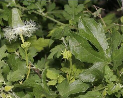 栝楼(Trichosanthes kirilowii Maxim.),属葫芦科栝楼属是多年生攀缘草质藤本植物,根状茎肥厚,圆柱状,地上茎多分枝,无毛,腋生带分枝的卷须;叶片近圆形或心形,边缘有疏齿或缺刻状;栝楼花单性异株,花托筒状,花萼裂片披针形,花冠白色,顶端细线状;果实近球形,熟时橙红色,有扁平形种子多。栝楼花期在5—8月,果期在9—11月。 [10]