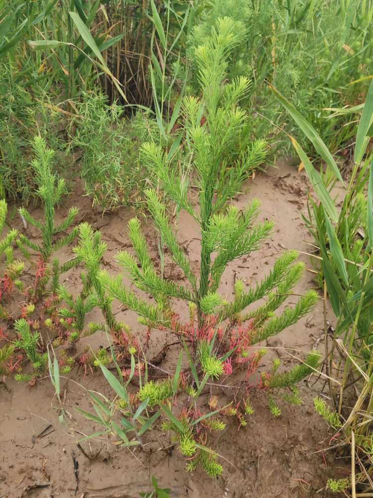 碱蓬(Suaeda glauca (Bunge) Bunge)是一年生草本,高可达1米。茎直立,粗壮,圆柱状,浅绿色,有条棱,上部多分枝;枝细长,上升或斜伸。叶丝状条形,半圆柱状。花两性兼有雌性,单生或2-5朵团集,大多着生于叶的近基部处。胞果包在花被内,果皮膜质。种子横生或斜生。花果期7-9月。 [1]