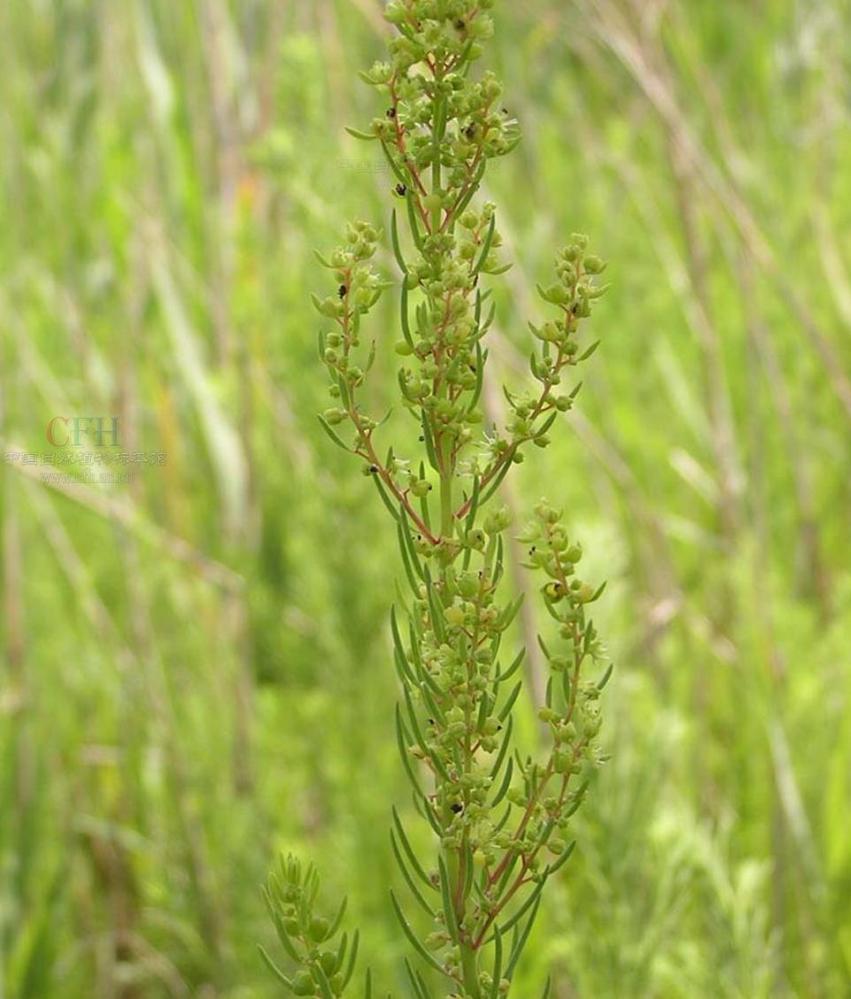 一年生草本,高可达1米。茎直立,粗壮,圆柱状,浅绿色,有条棱,上部多分枝;枝细长,上升或斜伸。叶丝状条形,半圆柱状,通常长1.5-5厘米,宽约1.5毫米,灰绿色,光滑无毛,稍向上弯曲,先端微尖,基部稍收缩。