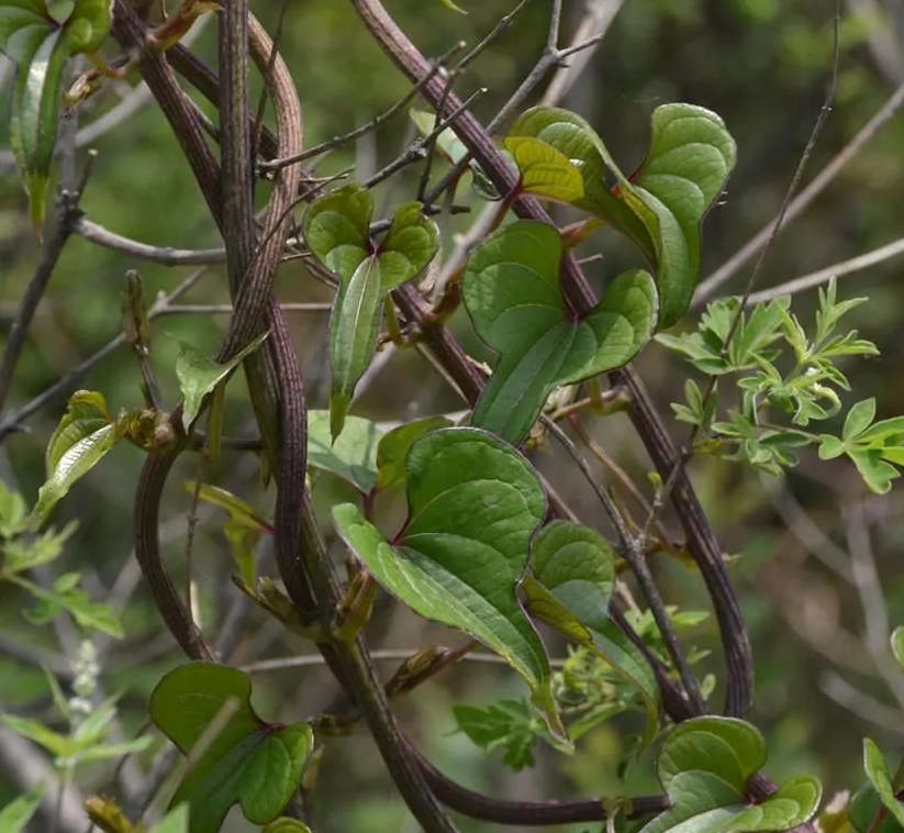 野山药是薯蓣科薯蓣属的缠绕草质藤本。块茎长圆柱形,垂直生长,长可达1米多,断面干时白色;茎紫红色,无毛;单叶,呈卵状三角形至宽卵形;雌雄异株,雄花外轮花被片宽卵形,雌花序为穗状花序,生于叶腋;苞片和花有紫褐色斑点;蒴果呈三棱状扁圆形或三棱状圆形,外面有白粉;种子四周有膜质翅;花期6-9月;果期7-11月。 [5]