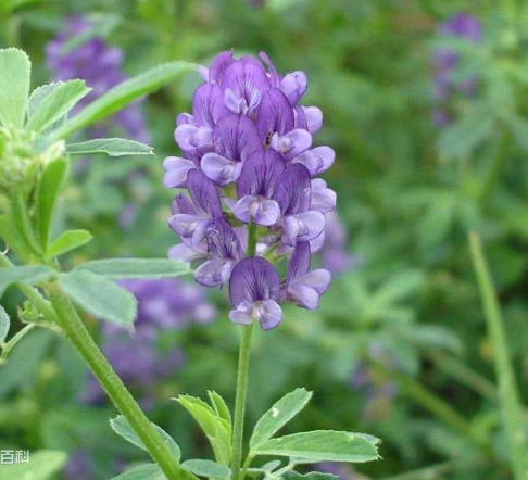 紫苜蓿,豆科苜蓿属多年生宿根草本植物,茎直立、丛生或匍匐,呈四棱形,多分枝;托叶较大,卵状披针形,小叶片呈倒卵状长圆形;花朵是成族状的总状花序;花梗呈尊钟状,花冠紫色花;果实螺旋形,熟时呈棕褐色;种子小而平滑,呈黄色或棕色;花期5—7月,果期为6—8月。 [9] 因其花开紫色,故取名为紫苜蓿。 [10]
