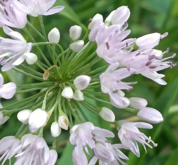 花葶圆柱状,具纵棱,有时棱不明显,高25-60厘米,下部被叶鞘;总苞单侧开裂至2裂,宿存;伞形花序半球状或近球状,多花;小花梗近等长,比花被片长2-4倍,基部除具小苞片外常在数枚小花梗的基部又为1枚共同的苞片所包围;花白色,稀淡红色;花被片具红色中脉,内轮的矩圆状倒卵形,先端具短尖头或钝圆,长(4.5-)5.5-9(-11)毫米,宽1.8-3.1毫米,外轮的常与内轮的等长但较窄,矩圆状卵形至矩圆状披针形,先端具短尖头;花丝等长,为花被片长度的1/2-3/4。基部合生并与花被片贴生,合生部分高0.5-1毫米,分离部分狭三角形,内轮的稍宽;子房倒圆锥状球形,具3圆棱,外壁具细的疣状突起。花果期6月底到9月。 [1]