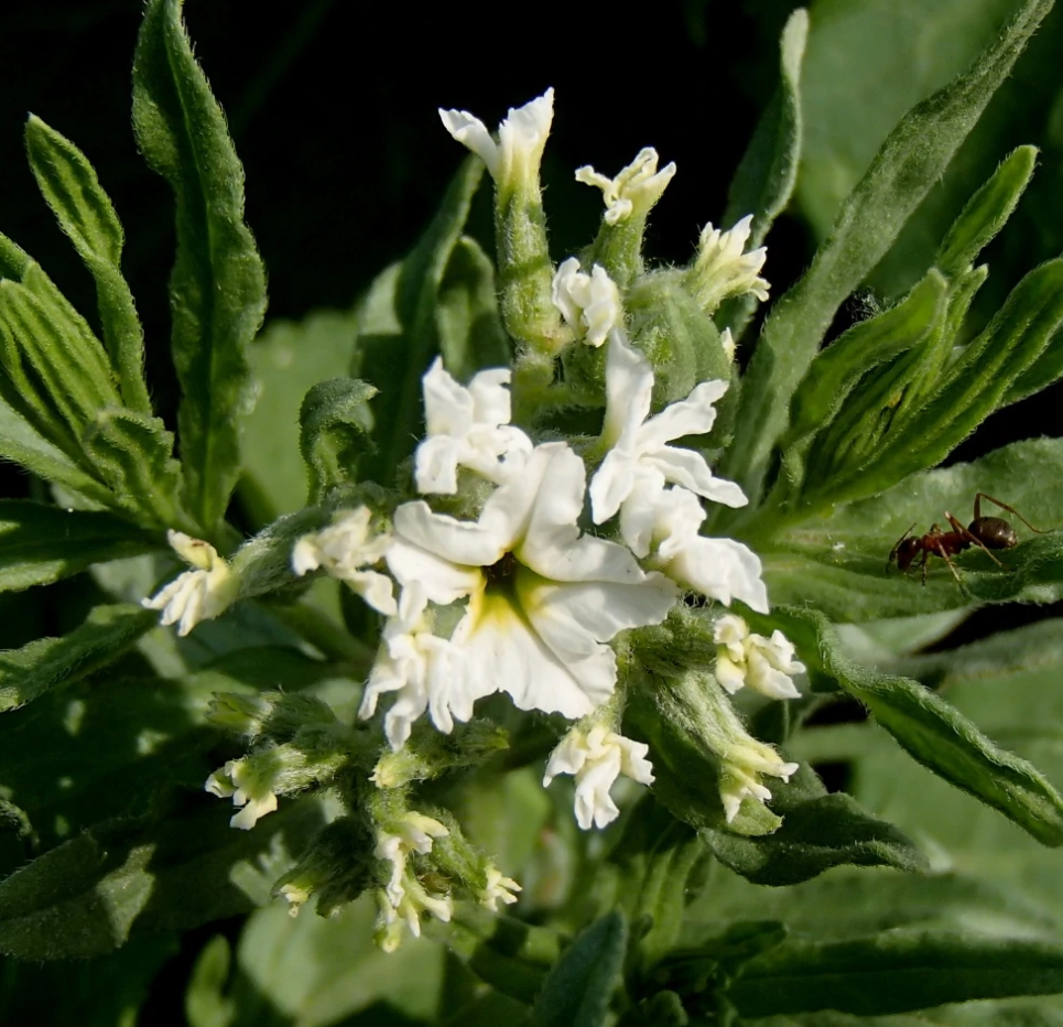 花序顶生,直径1.5-4厘米;萼片披针形,长3-4毫米,密生向上的糙伏毛;花冠黄白色,钟状,长1-1.3厘米,裂片卵形或长圆形,外弯,花冠筒较裂片长,外面密生向上的糙伏毛;花药长圆形,长2.5-3毫米,先端具短尖,花丝极短,长约0.5毫米,着生花筒中部;子房无毛,略现4裂,长0.7-0.9毫米,花柱细,长约0.5毫米,柱头浅2裂,长0.7-0.8毫米,下部环状膨大。核果椭圆形或卵球形,长7-9毫米,直径5-8毫米,粗糙,密生伏毛,先端凹陷,核具纵肋,成熟时分裂为2个各含2粒种子的分核。花期5月,果实7月成熟。 [2]