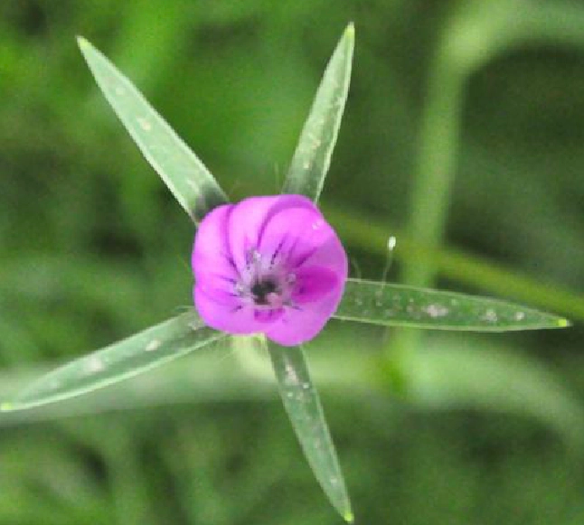 麦仙翁(Agrostemma githago L.),石竹科麦仙翁属一年生草本植物,茎单生,直立,不分枝或上部分枝;叶线形或线状披针形,基部微合生,中脉明显;花单生;花梗长;萼筒椭圆状卵形,后期微膨大,萼裂片线形;花瓣紫红色,较花萼短,爪窄楔形,白色,瓣片倒卵形,微凹;花期6~8月,果期7~9月。 [4]